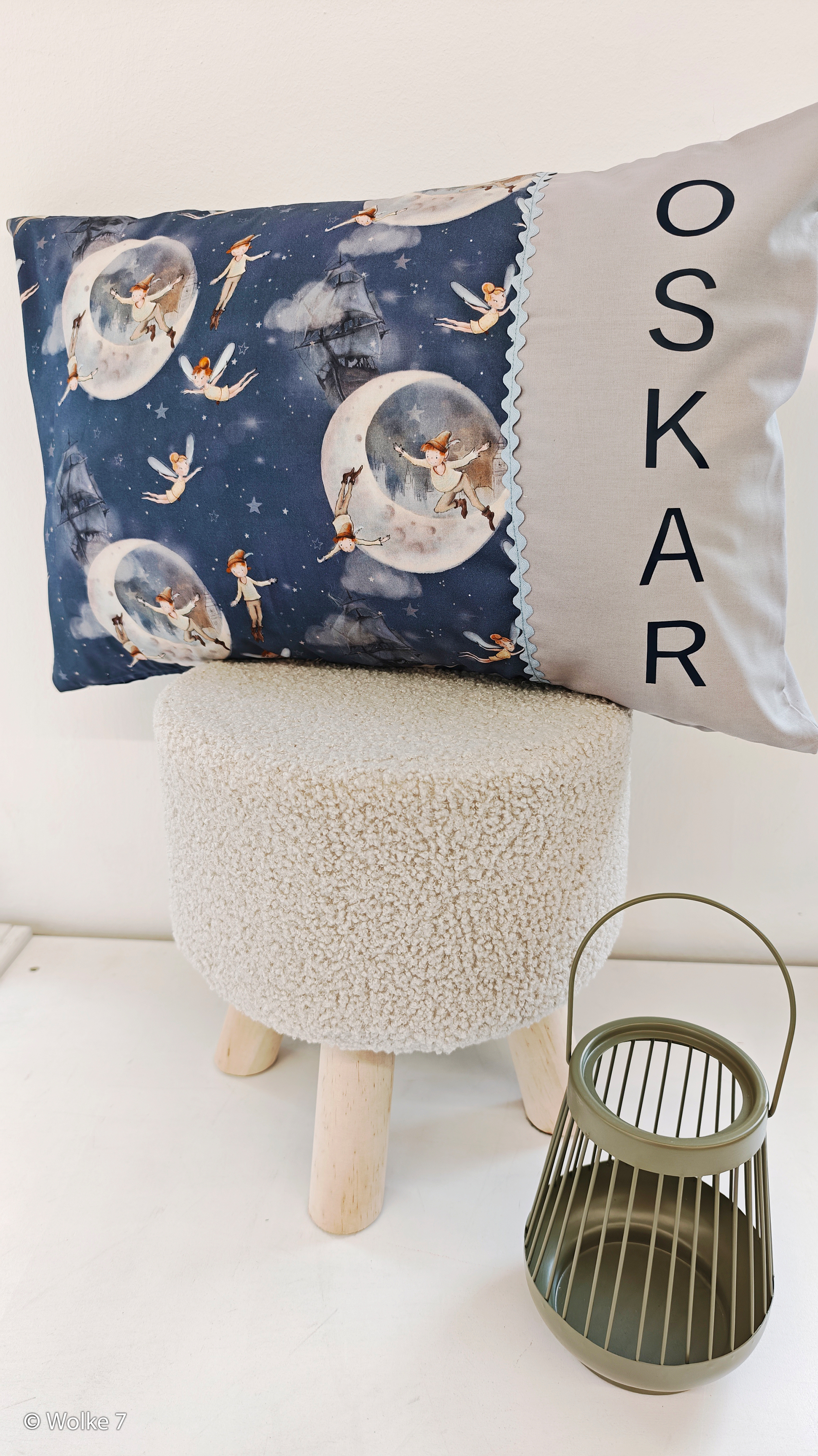 🌙 Magical Night Flight – A dreamy night scene features a flying boy accompanied by a small fairy, with the moon and a sailing ship in the background – available in light blue and deep denim blue. Perfect for cushions, bedding or reading accessories.