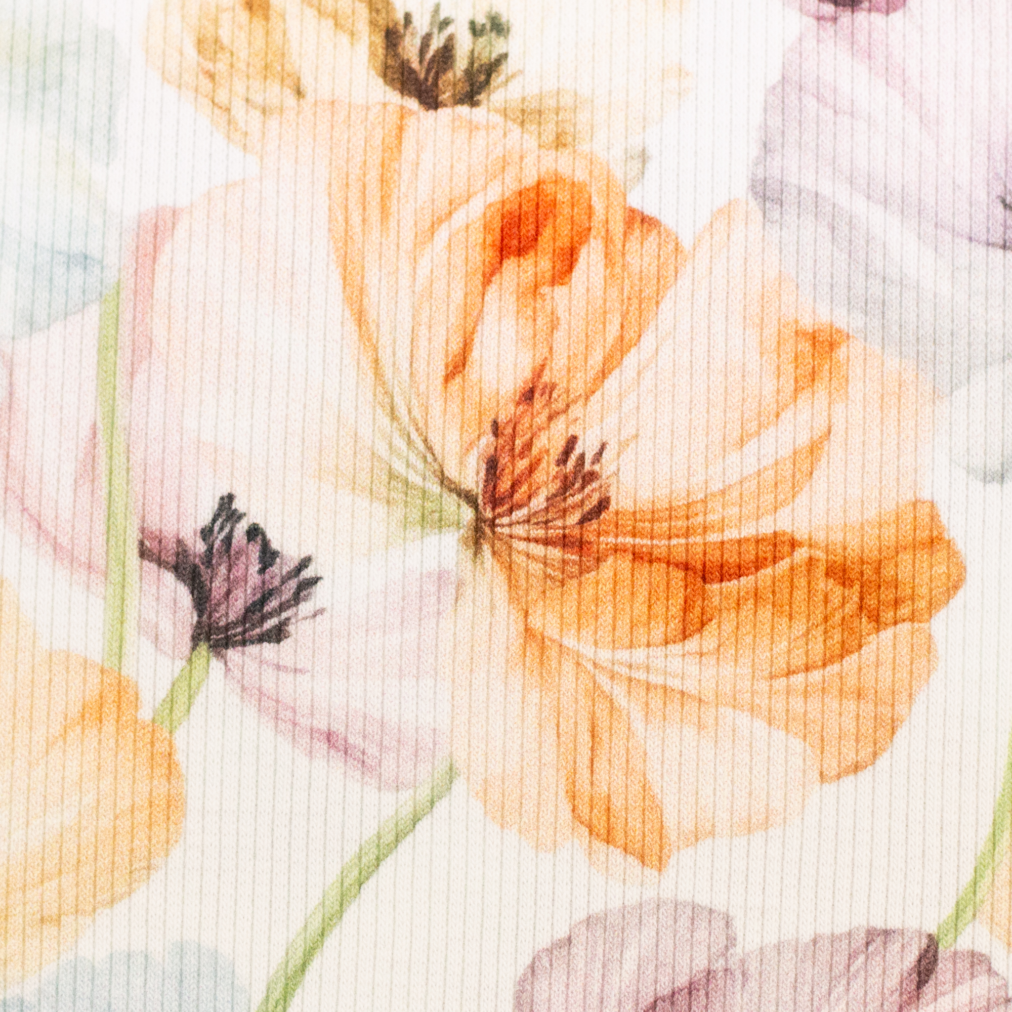 Iva is a modern rib jersey featuring a textured surface and delicate floral designs. The fine rib structure adds depth and a pleasant textile feel, while the stretchy cotton jersey remains soft against the skin and drapes beautifully. Despite its structure, Iva feels balanced and flexible rather than heavy or stiff, making it ideal for garments that combine comfort with a distinctive look.