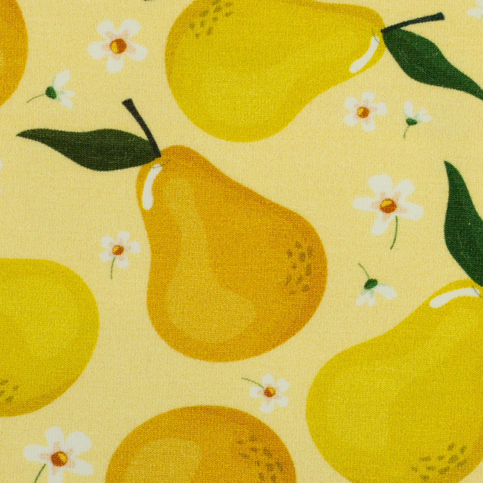 Ergänzt wird Melody durch fröhliche Fruchtmotive. Zitronen, Birnen, Orangen und Limetten bringen sommerliche Frische, teils kombiniert mit dezenten Streifen für zusätzliche Struktur. Erdbeeren und Kirschen sind in mehreren Farbvarianten erhältlich – von zartem Rosa über Pink bis hin zu Blau- und Grüntönen. Die Motive sind klar gezeichnet, gleichmäßig verteilt und lebendig, ohne dominant zu sein.