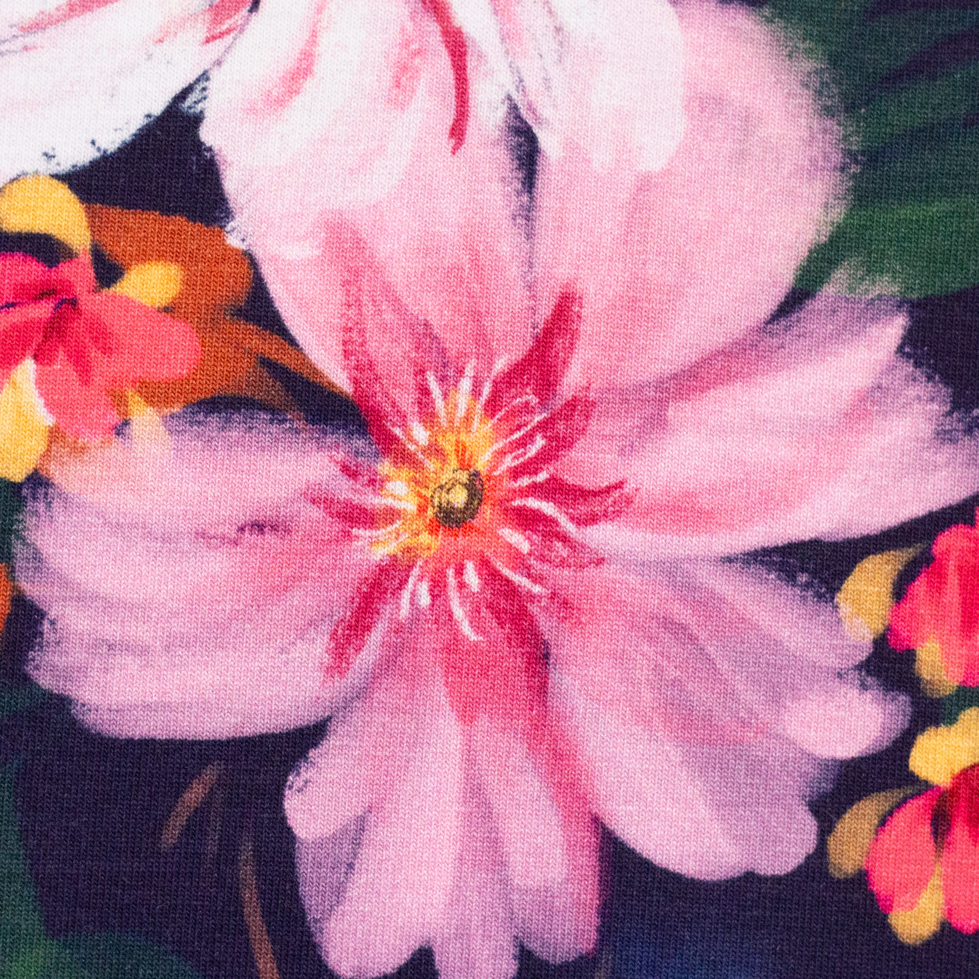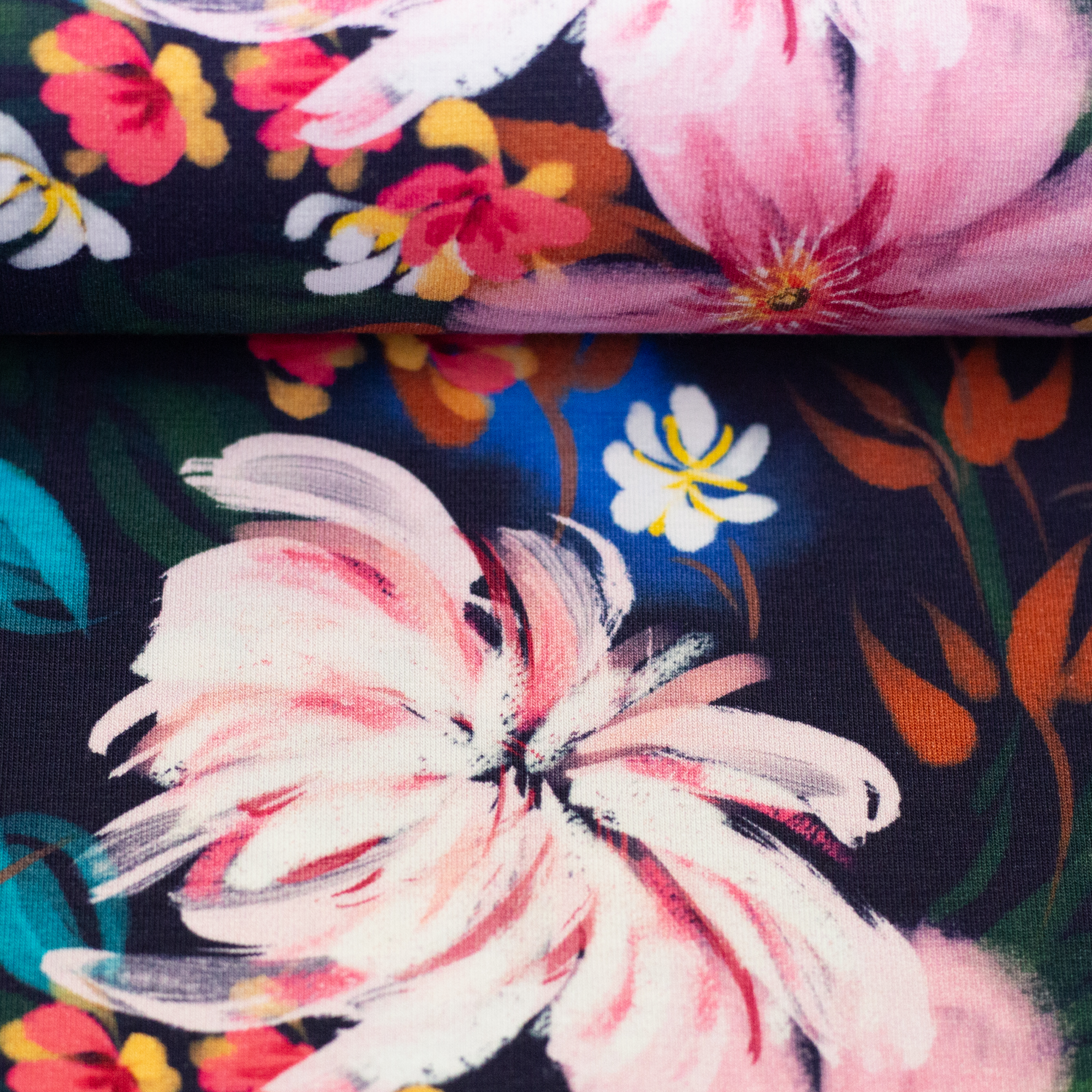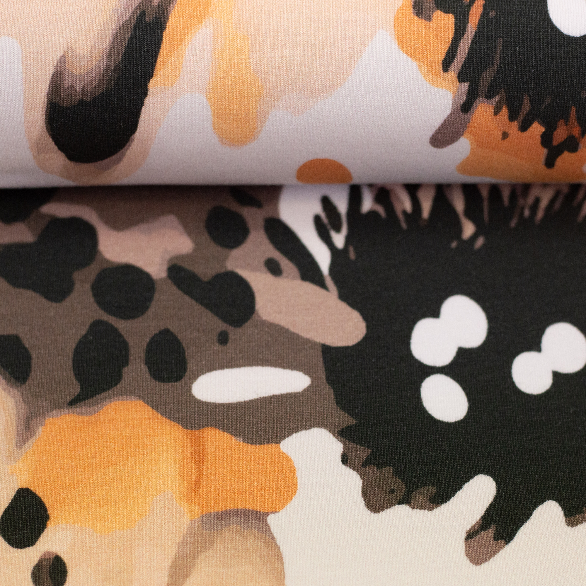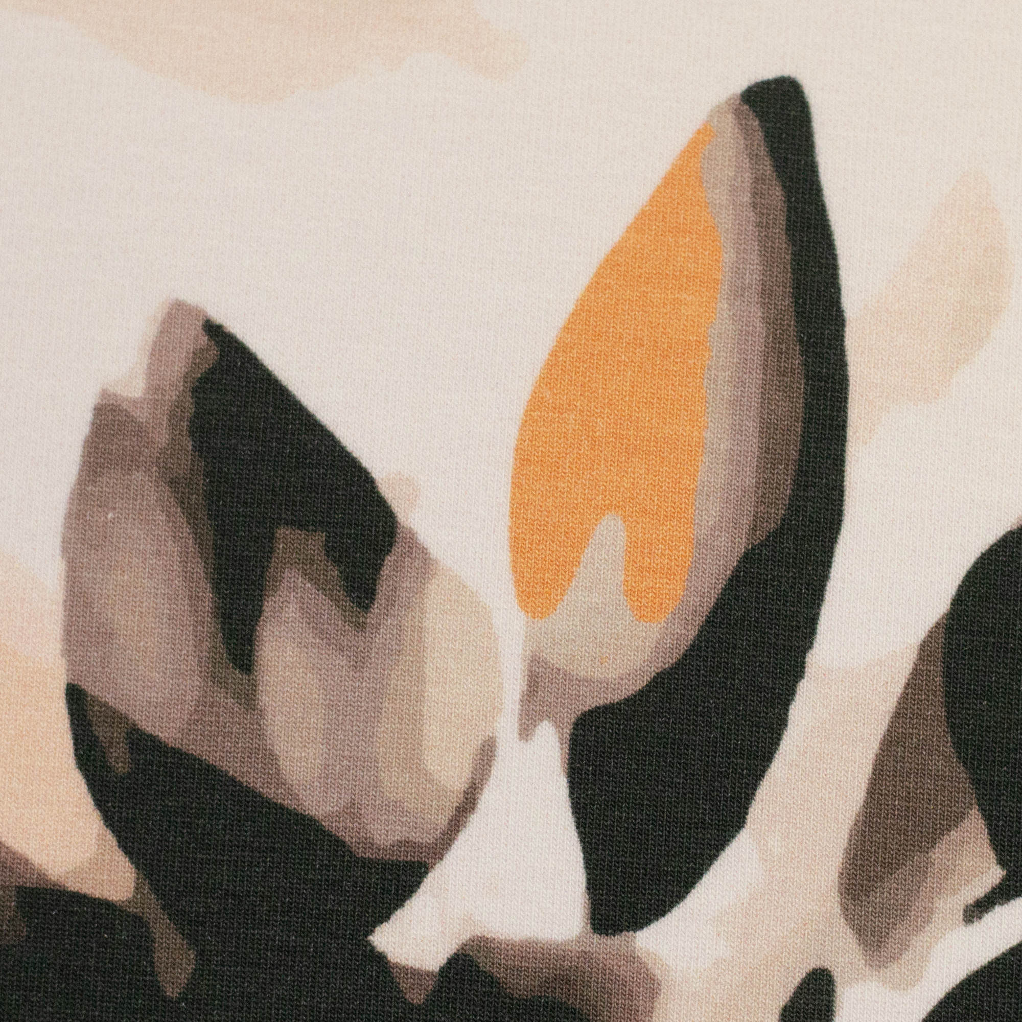 Olivia ist ein Baumwolljersey mit zurückhaltender, erwachsener Designsprache. Erdige Farben, dunkle Blautöne und sanfte Kontraste zeigen, dass Sommerstoffe nicht laut sein müssen. Neben einem ausdrucksstarken Leo in Apricot und Schwarz finden sich abstrakte florale Motive, deren Blüten sich erst auf den zweiten Blick erschließen.